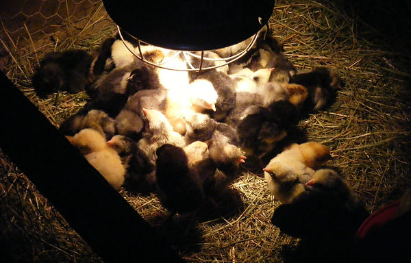 2 Tage alte Hühnerküken, schön unter der Wärmelampe zusammengekuschelt. Noch 3 oder 4 Tage und sie flitzen durch den Stall.